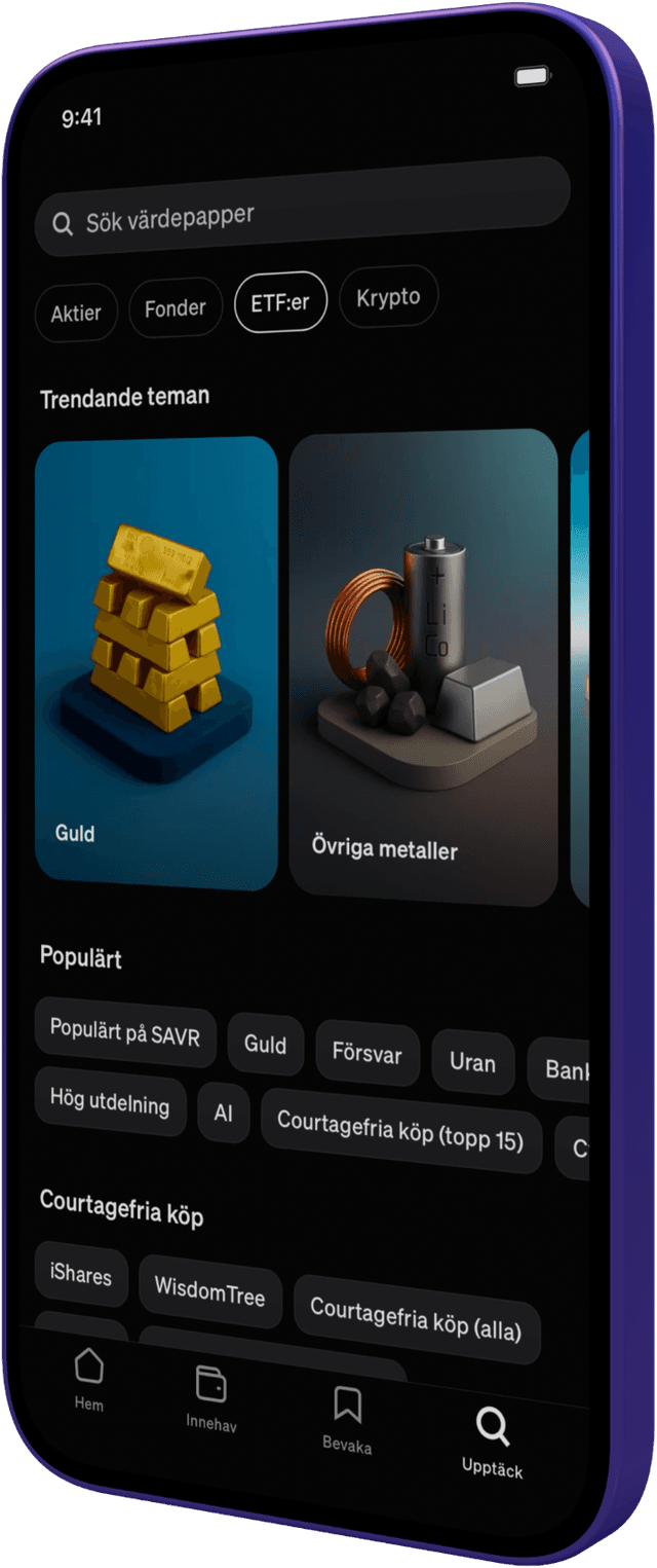 Köp ETF:er från populära förvaltare som VanEck, WisdomTree och BlackRock utan courtage. Logga in och kika under Upptäck för att se hela listan över vilka ETF:er som omfattas.